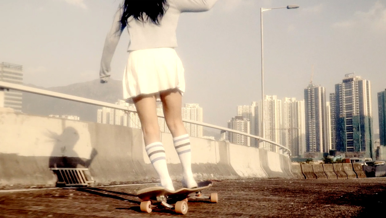 The plot is a love story between two very different worlds: a girl from Hong Kong who skates the urban canyons on her longboard falls in love with a stranger from Europe. They are so close yet so far. That symbol is also carried by the dichotomy between the pictures and the music: it sounds so calm and wide while it looks so busy and crowded. We flew to Hong Kong on Christmas Eve to start our four-day-hunt for the perfect canvas to our picture. It was also the first time we met our protagonists: Yoonji and her longboard came from South Korea and Thomasz had already been in town working as a model. We took a cab to aimlessly wander through the city. We kept our eyes open and whenever someone of us had the feeling that a place would be good for the video, we stopped, got out of the car and started shooting.