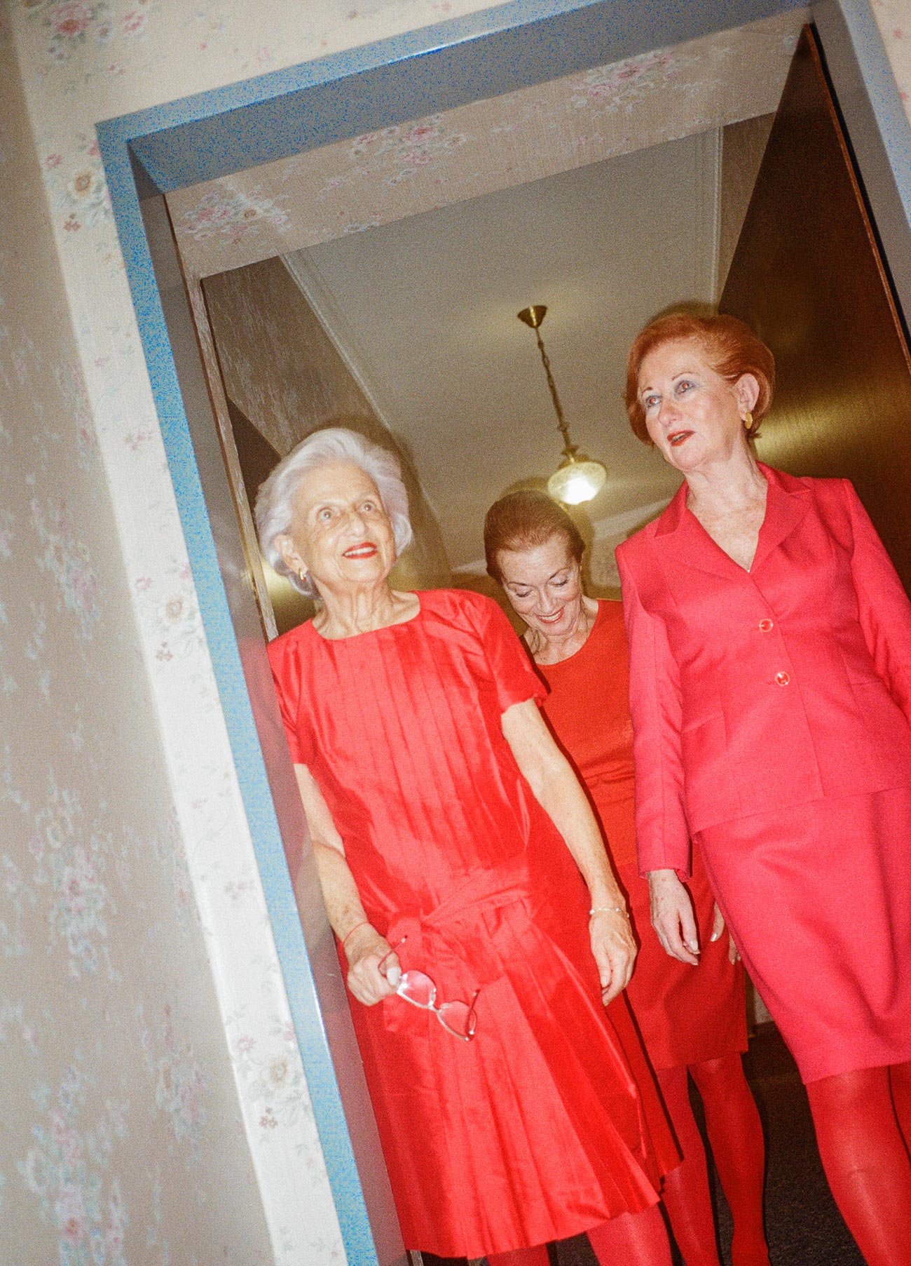 They have now been married for 64 years, and this time he was to join her in her fame, and alongside Opa, Oma’s best friends Sonja and Fela.” tells photographer Gioia Zloczower about this, undoubtedly phenomenal, photo shooting. “Oma & Friends at Hotel Urania” as Gioia named the story, smiles when she explains how she introduced the idea to her grandma. “All you have to bring is a pink channel suit and a red dress, I’ll get the red tights!” she told her enthusiastically on the phone when putting on her best ‘speak-in-your-sweetest-tone-to-your-Oma’s-friends’ voice and asked her to join the shoot. “The goal is we’re making a spoof of Manner Schnitten and Austrian Airlines! I’ve booked two rooms at Hotel Urania already!” she added. And Gioia continues: