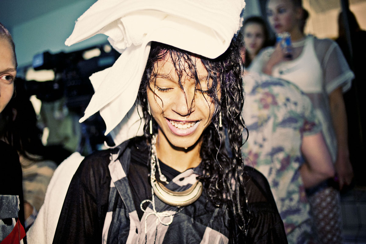 Water games and colourful dolphin fun. Swedish brand Cheap Monday presented its Spring 2015 collection “MINDLESS OPTIMSIM” yesterday in Stockholm. And it´s all about scribbled, doodly prints, biker cuts, longer silhouettes mixed with a sporty look. Another pop out-theme is a super trashed denim look, contrasted by tinted pastel shades in over dyed jackets and bottoms. Enjoy some backstage impressions photographed by Sima Korenivski.