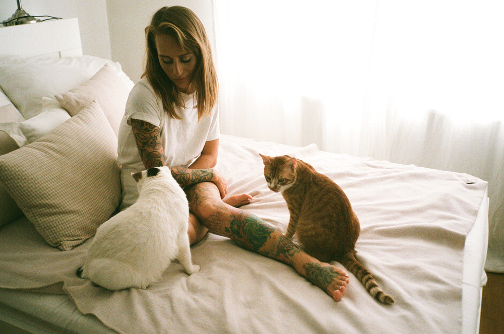 Cats are in the air. Photographer Francesco Vezzola met up with Almira Avdyli, a freelance make-up artist and also aspirant Vienna born photographer with Balkan origins. Having worked together at Francesco´s previous series “hitzewelle“, this time they met at her home in Hietzing and were joined by the two wonderful cats Rabbit from Bosnia and Weasley from Turkey. ” Rabbit looks like a dog and acts like one too. Maybe due to having lived through an identity crisis being a gang member of a dog gang. With leaving the gang he had to say good bye to his tail as well. Today he has found himself; a sensitive artist, loves music and delicious fish. Weasly is the sporty spirit in the family; all through a whirlwind. He loves high jumps and free running on my head. All of us have different nationalities but we anyhow speak the same language: Cuddling!” reveals Almira about her two model partners. All three of them are gorgeous, aren´t they?