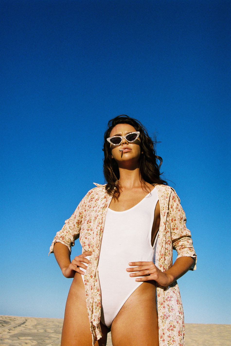 Ainsley Hutchence of Sticks and Stones Agency just “wanted to go straight to the beach on this perfect Australian Summer day & drape the Turkish towels & bags of Chasing Sundays over a hot natural babe with my team.” Blue sky and creamy sand. Just ideal working conditions! Production by Bang Bang Shooting Club starring Graison Howell. Digital photograpy by Troy Freye and film photography, art directon and styling by Ainsley Hutchence.
