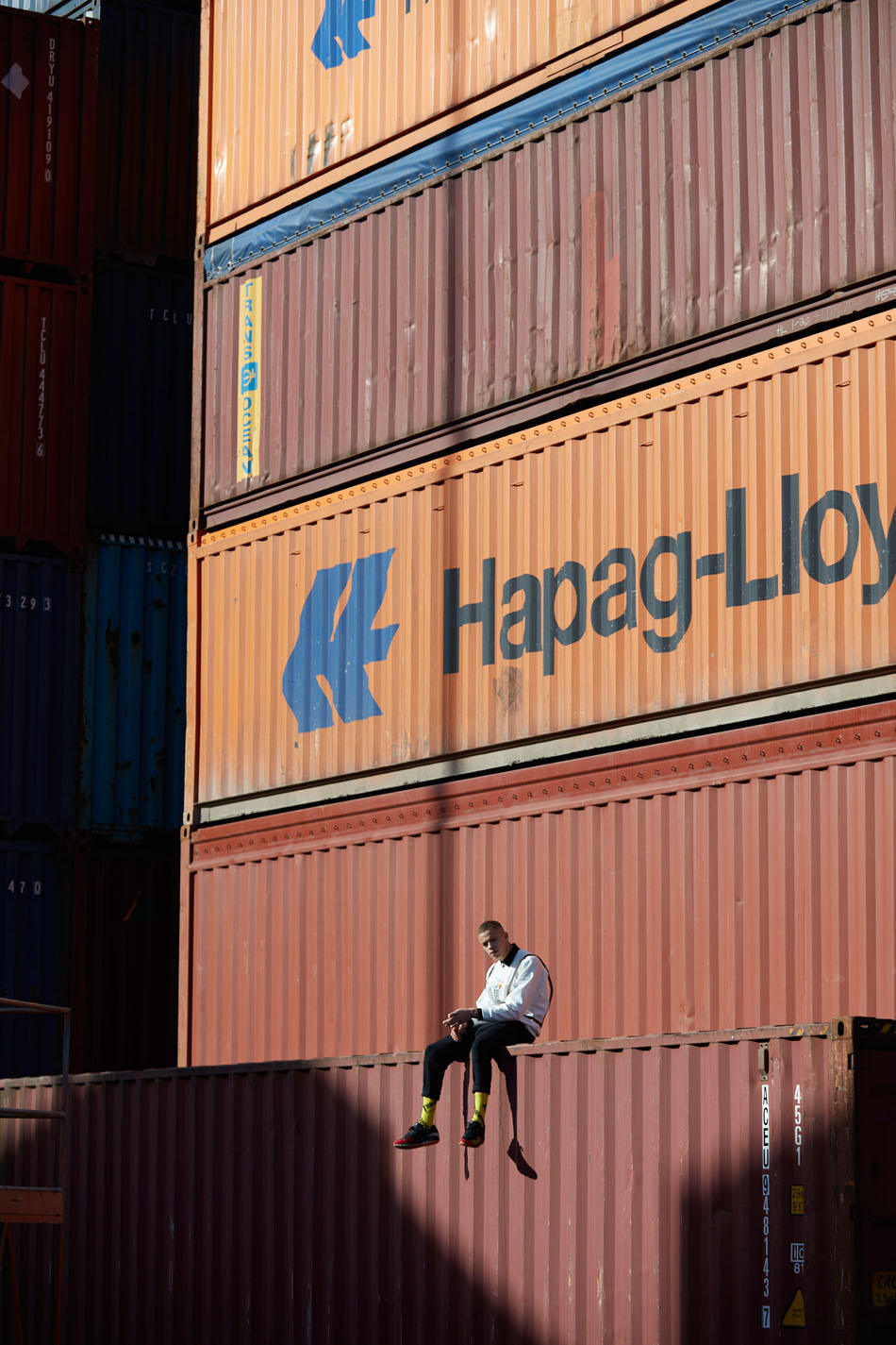 “China Shipping” – A fashion story photographed by Mark Carrol starring Joel Mcleoud of Storm Models and Sasha Tesor of Jadore Models. Styling done by Rebecca Tessler and make-up done by Emily Bowden. Clothing by Adidas, Casual Friday, Asos, Huf x Trasher, Patta, Stussy, Topshop, Obey, Umbro x Hoh, Reebok, Duet Ldn, New Era, Hundreds and New Balance.
