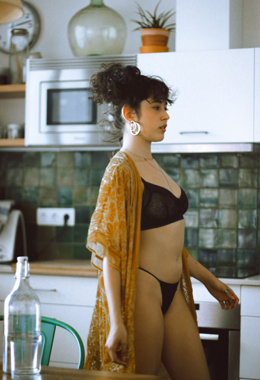 “We spent a warm sunset together. We met for taking pictures but all we did was play.” Photographer Pablo Gil laughs. “Maria and me played with light, we played with colors, heat and freshness. Green, white, yellow, red. We turned the bedroom into a flamenco show, and the living room became a sacred temple right away. It was an intimate game of laughters, characters and fun. I guess that is our Spanish essence.”